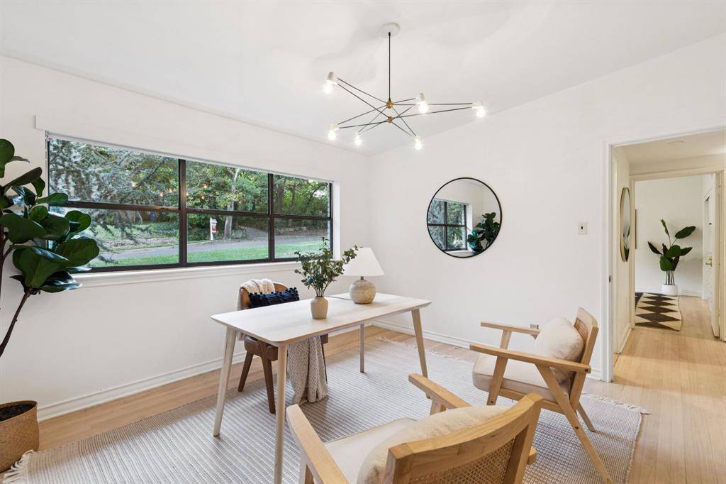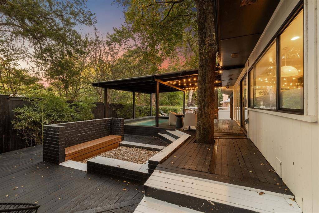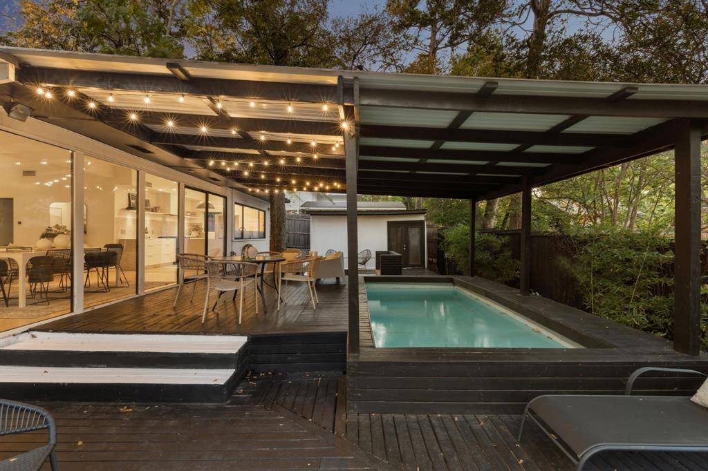 Tucked away on a quiet cul de sac in coveted Ravinia Heights, this stylish mid-century modern is your Palm Spring oasis in the heart of Dallas. Rolling hills, mature trees, and winding roads lead you to this sanctuary. Renovated in 2018, this chic abode boasts three spacious bedrooms and two sleek bathrooms. From the moment you enter, you're welcomed by rich hardwood floors and stunning vaulted ceilings that open up to a bright and airy living space. The seamless open floor plan effortlessly connects each area, perfect for modern living. Slide open the glass doors to discover your outdoor oasis, complete with a backyard deck, an above-ground pool, and twinkling string lights, setting the scene for unforgettable gatherings. Just a stone's throw away from the eclectic Bishop Arts District, picturesque Kessler Park, and the bustling energy of Downtown Dallas.
