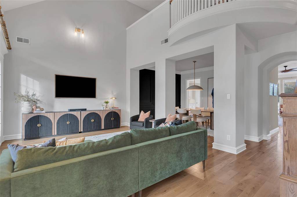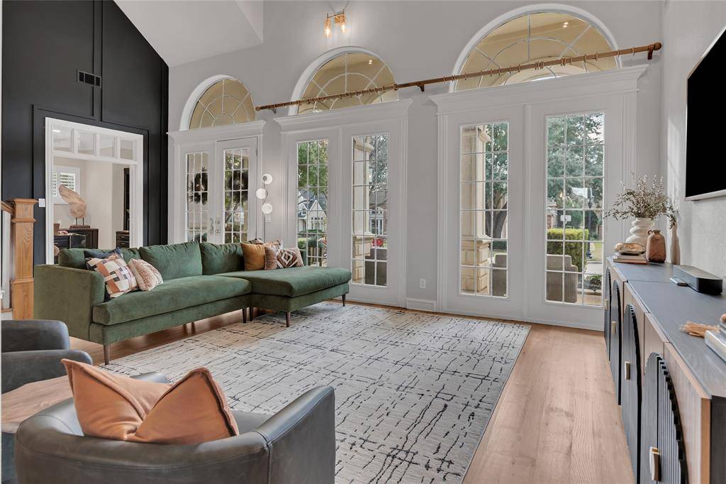 Inside, the home showcases soaring ceilings, wide-plank hardwood floors, and a light-filled open layout designed for both everyday living and elegant entertaining. The stunning two-story living room features expansive arched windows, flooding the space with natural light and seamlessly connecting indoor and outdoor living. A dramatic staircase and balcony overlook add architectural interest and timeless appeal.