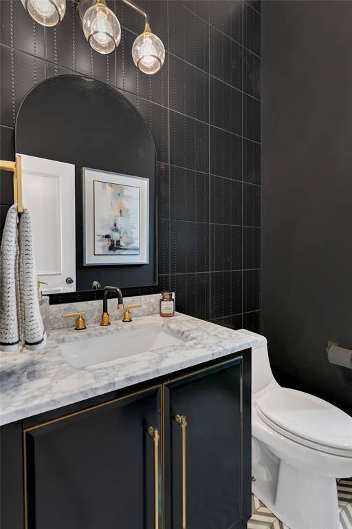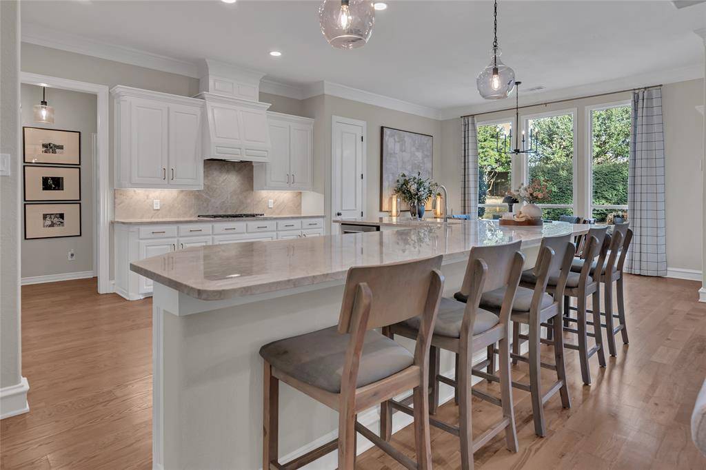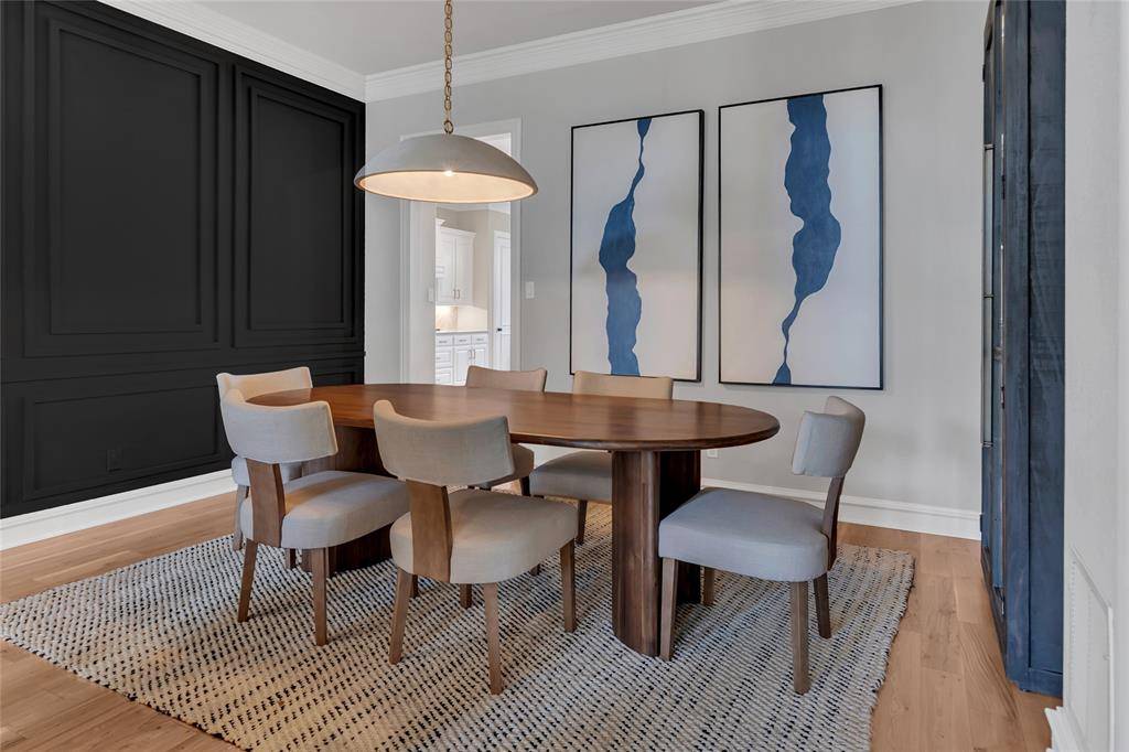 The private study is beautifully appointed with custom built-ins and French doors, offering an ideal work-from-home space. The formal dining room is framed by custom wall detailing and designer lighting, providing an inviting setting for gatherings and special occasions.