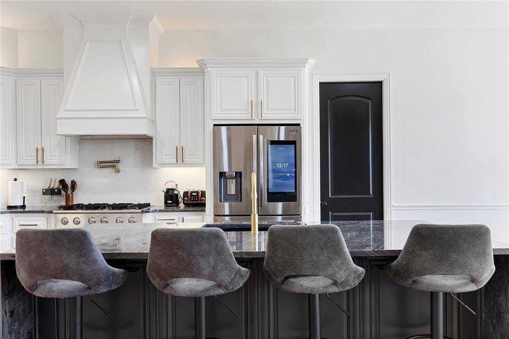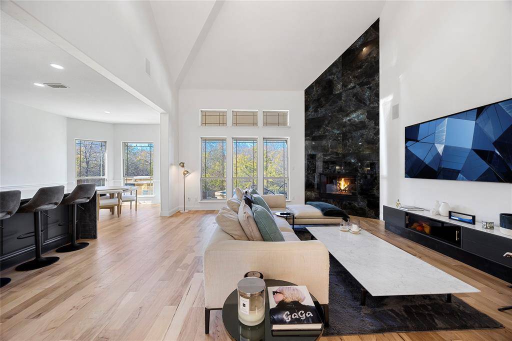 Blending refined luxury with peaceful seclusion, the home is equally suited for everyday comfort and elevated entertaining. From the moment you enter, it's clear this is somewhere special. The expansive open-concept layout showcases a beautifully renovated chef's kitchen featuring a dramatic waterfall island, premium stainless-steel appliances, and generous counter space. Soaring ceilings and a striking fireplace feature wall anchor the main living area, creating an inviting setting for gatherings year-round.