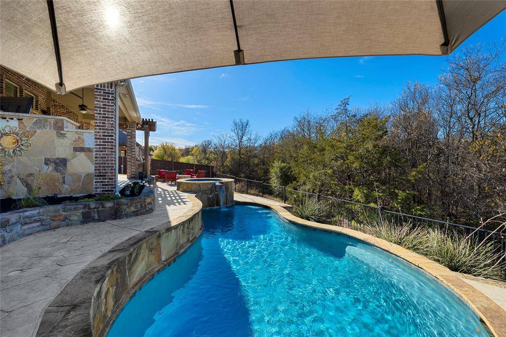 Outdoors, a private resort-style retreat awaits. Enjoy a custom pool and hot tub, two fire pits, outdoor TV, and a fully equipped kitchen ideal for al fresco dining. Surrounded by lush greenery and overlooking the preserve, you'll often spot deer grazing just beyond your backyard. In warmer months, step directly onto scenic walking trails that lead toward the Grapevine Lake area.