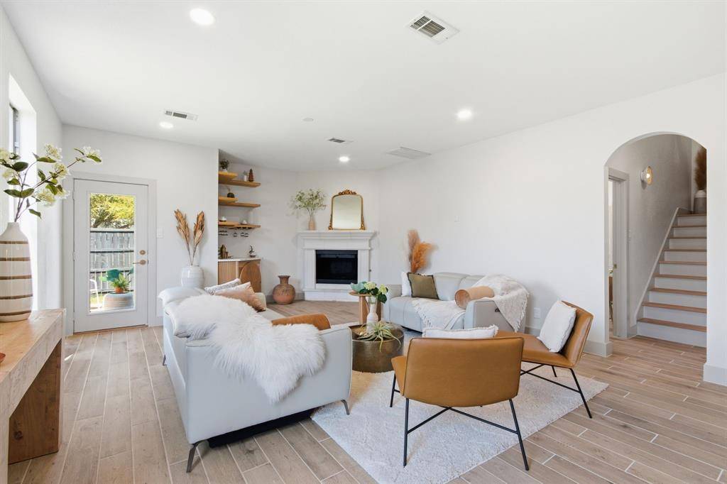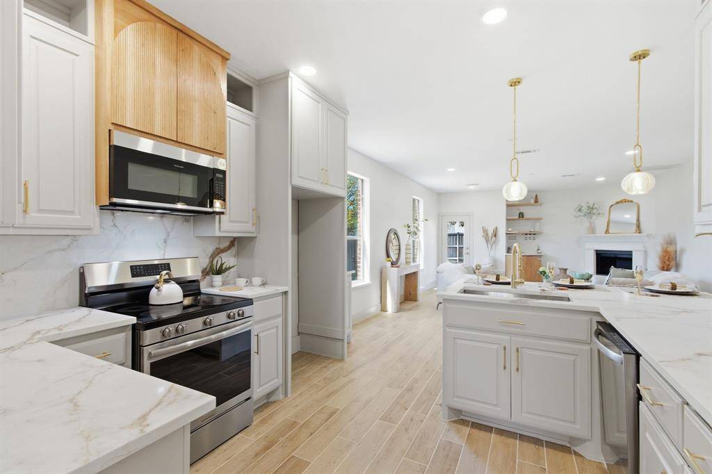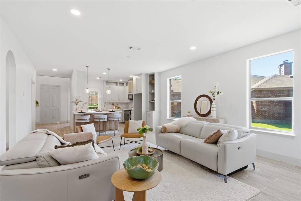 The open-concept layout is filled with natural light, highlighting updated flooring, designer fixtures, and carefully curated details throughout.