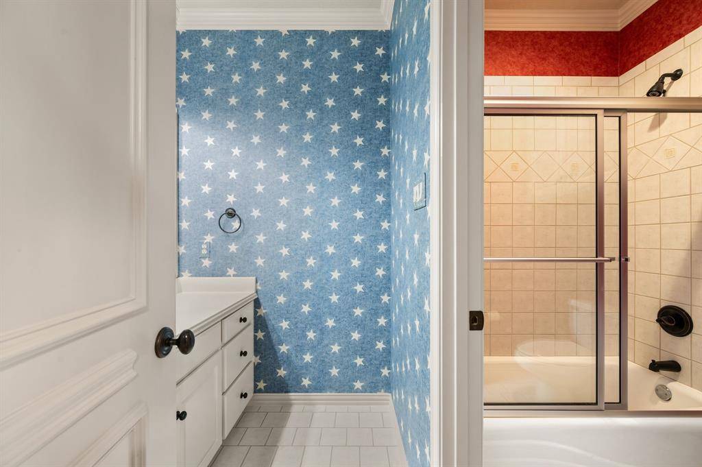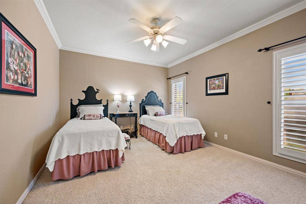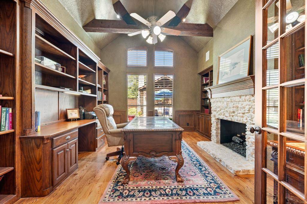 From the moment you enter, the home showcases high ceilings, rich wood flooring, extensive crown molding, solid core doors, custom ceiling treatments, and abundant storage throughout the home. The private office features built-ins, a rough truss ceiling treatment, and a fireplace, creating a warm and impressive workspace. The island kitchen is designed for both everyday living and entertaining and includes a commercial grade gas range, pot filler, built-in refrigerator, granite countertops, large island, and a butler's pantry complete with an ice maker. The kitchen opens to the spacious living room where the focal point is a beautiful stone fireplace and tall ceilings with views of the backyard and outdoor living area. The breakfast area includes a built-in buffet cabinet providing additional storage and serving space. The first floor primary suite offers a luxurious private retreat, while a first floor guest bedroom provides flexibility for guests or multi-generational living. Additional functional spaces include a laundry room with sink and extra storage. Upstairs features a large game room with a Juliet balcony overlooking the entry, plus a snack bar with beverage refrigerator and microwave, and a full media room with a dedicated media control closet, creating the ultimate entertainment space. Additional home features include a tankless water heater, extensive storage areas, and high-quality custom construction throughout. The backyard is designed for entertaining and outdoor living and includes a complete summer kitchen featuring a built-in grill, two gas burners, built-in cooler, beverage refrigerator, fireplace, and bar seating. The outdoor living space also includes a cedar pergola with a swing, along with a pool and spa, creating a private backyard retreat perfect for entertaining, relaxing, and enjoying Texas evenings. Centrally located near DFW International Airport, Las Colinas, and Westlake, making it an ideal location for professionals.